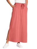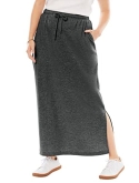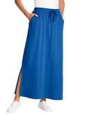 This maxi skirt is made in a sporty knit jersey and has an elastic waistband with drawstring to accent the athleisure style. Side slits in the hem allow for easy movement, and side seam pockets are a favorite added detail. Perfect for pairing with anything from sneakers to flat to sandals, this relaxed style is the ultimate in comfort dressing.