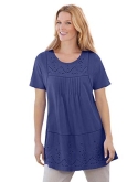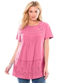 This beautiful tunic with openwork embroidery has the look of a gorgeous blouse but feels like a comfy tee. Pintucks on the chest and eyelet details create an airy feel thats so pretty. Made in a perfect tunic length that falls over the hips.