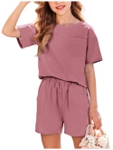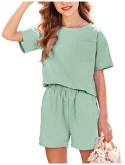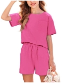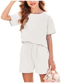 Design: Lounge sets sleeve linen T-shirt and shorts set is featured as round neck, side slit, two side pockets and elastic band.