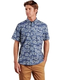 A spread collar, short sleeves, and shirttail hem offer a classic hem.