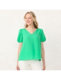Straight hem Short sleeves V-neck Flowy fit 26.5-in. length from shoulder to hem Polyester; Cotton Machine wash Imported