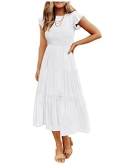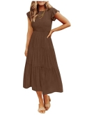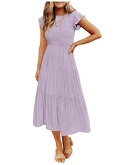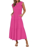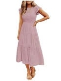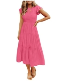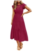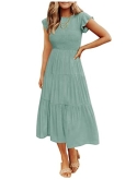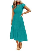 This bold and breezy midi dress has a flattering elastic shirred top, features a crew neck, solid color, high waist, short cap sleeves, edged with playful frills at shoulder, back key-hole closure and a flowy tiered midi skirt, adds more feminine.