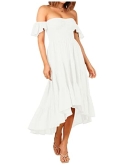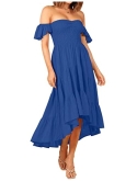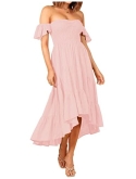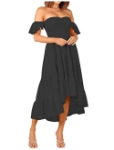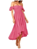Chic and romantic, this midi dress comes with ruffled short sleeve, off shoulder design, smocked bodice, high waist, solid color, match with a big asymmetrical skirt.