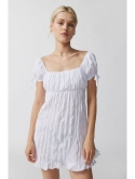 Swingy mini dress made from a textured crinkle fabric from Kimchi Blue. Cut short in a babydoll silhouette with puffy sleeves, a square neckline and an empire waist. Complete with a tie-back construction. Find it only at UO.