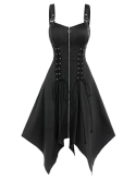 [Basic Features]: Hanging strap design, zipper+strap, sleeveless fluffy, dark style, with tassels at the hem, perfect calf length, waist lace up, and a flowing layered hem.