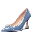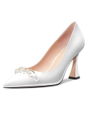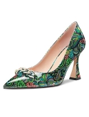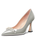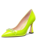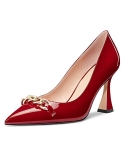 Elevate your shoe game with our pointed-toe chunky heel pumps with chain embellishments.
