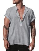 Feature- Cotton linen henley shirt, button-down closure, short sleeve, henley neck, soft fabric, solid color, and with patch pocket at chest, can use to storage something, like key and coins etc, basic design, handsome and stylish.