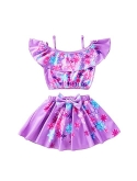 Features: Off shoulder ruffle spaghetti strap girls bathing suit, digital flower print, cute bow ruffle skirt princess swimwear, girls 2 pieces bikini sets, brightly color, Magic Family Adventure swimsuits for girls.