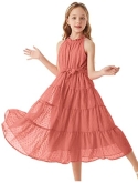 Chic Design for Girls Our summer maxi dress features an elastic waistline, comfortable swiss dot fabric, fully lined A-line silhouette, keyhole back with button, halter neck, ankle-length flowy swing load leaf hem, and a stylish belt that can be tied at the front or back of the waist.