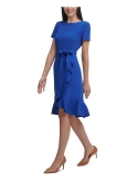 Detachable matching tie sash at waist; tulip hemline with ruffled flounce
