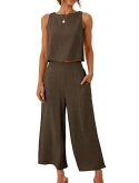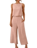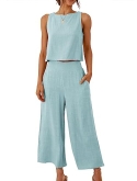 Features - This 2 piece outfit features a sleeveless round neck crop top, wide-leg cropped pants, button back, high waist, and a wide waistband for added comfort.