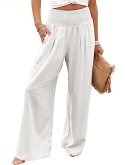 Feature - Smocked high waist, wide leg, loose fit lounge pants with pockets, linen beach pants for women cover up, flowy dressy pants comfy and chic
