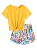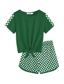 Features: Simple crew neck design, basic solid color, cute short sleeve plaid tee with front tie and plaid shorts. Shorts are elastic waist design make kids more convenient and comfy