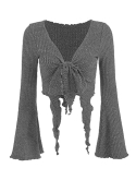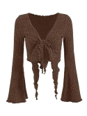 Features: V neck, long sleeve, bell sleeve, tie front, lettuce trim, slim fit, fashionable