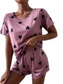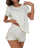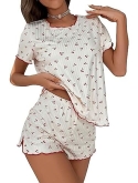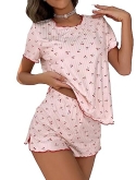 Feature: Round neck, short sleeve, cute print, lettuce trim, split, shorts sets, womens pajama sets, fashionable