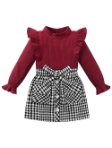 DESIGN: Ruffle long sleeve tops, knitted t-shirt tops plaid mini skirt set, elastic waist button skirt with pockets and belt, bowknot belt design, very beautiful, 2pcs spring fall winter clothes for little girl.