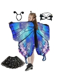HALLOWEEN PARTY DRESS FOR GIRLS AGES 6-12 - Girls butterfly costume measures 54 inch (width) x 44 inch (height) - Perfect for girls that 3' 5" -4' 5" tall. The lace eye-mask measures 12 inch (width) x 4.7 inch (height). The adjustable ribbon at the neck and the finger loops allow you to wear and take off the kids butterfly wing safely and easily. Besides, you can easily adjust the tightness of the lace mask and the antenna headband.