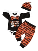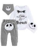 The halloween newborn outfit boy have 1x Long sleeve black romper tops,1x Long sleeve white bodysuit tops and 1x halloween pants.