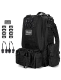 Multiple Pockets & Multifunctional accessoriesThis military backpack has one main large compartment, one front detachable bag which can be used as a tactical fanny pack separately, two side detachable tactical backpack accessories bags which can be used as first aid bags. This military tactical backpacks is equipped with 1x USA Flag Patches, 4 x Molle Clips, 8 x D-Ring Tactical Carabiners.
