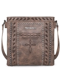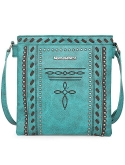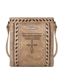 This western purse accented with antique silver studs.Embroidered cut-out boot scroll with stitch detail.Antique buckle on the front.