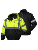 Features-1 removable hood, 1 inner chest pocket, 2 lower slant pockets, 2 mic tabs, 1 cell phone pocket, 1 clear ID holder, and 2 pen holder pockets on sleeves. This men's high visibility jacket features in neon yellow with black on the wrist and bottom front to enhance color contrast while hiding dirt in key areas