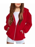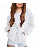 Design: Solid Color, Lapel, Zipper Sweatshirt, Kangaroo Pockets, Dropped Shoulder, Ribbed Hem And Cuffs, Loose Fit Style, Casual Tops For Girl