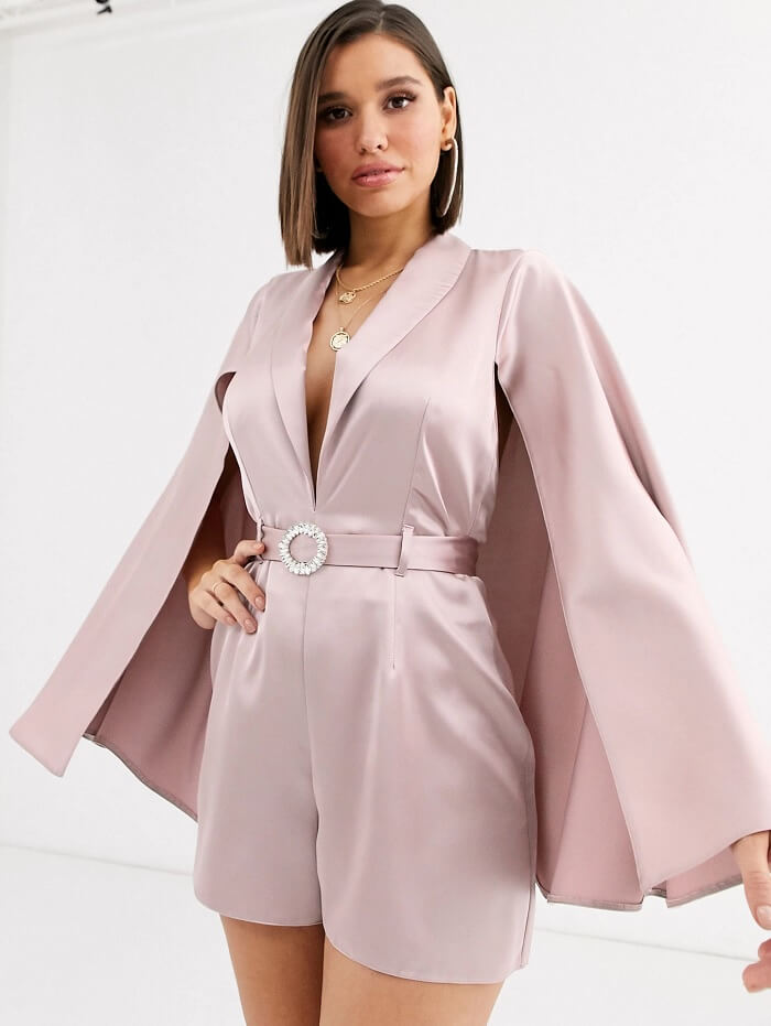 The one-shoulder romper has various designs that you can own. It has one-sided flared sleeves, bell sleeves, sleeveless, full sleeves, etc. Pair it with a heel and stylish clutch and you are all set to party!